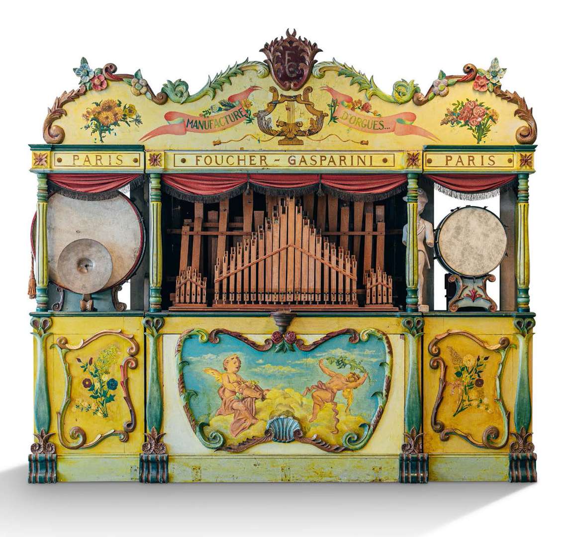 Grand orgue orchestre à carton perforés, décor en bois peint, peinture écaillée par endroits