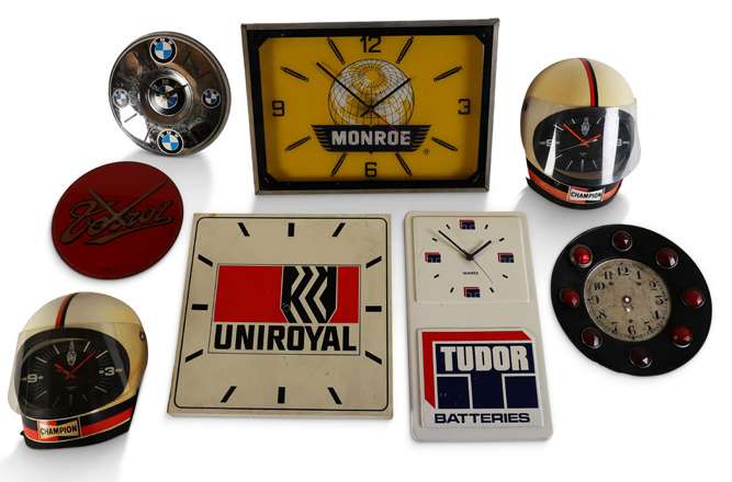 Lot de 8 horloges dont 2 casques Champion Spendia Paris, Terrot Elgé Diffusion, BMW, Monroe (35 X 49 X 12 cm), Uniroyal, Tudor