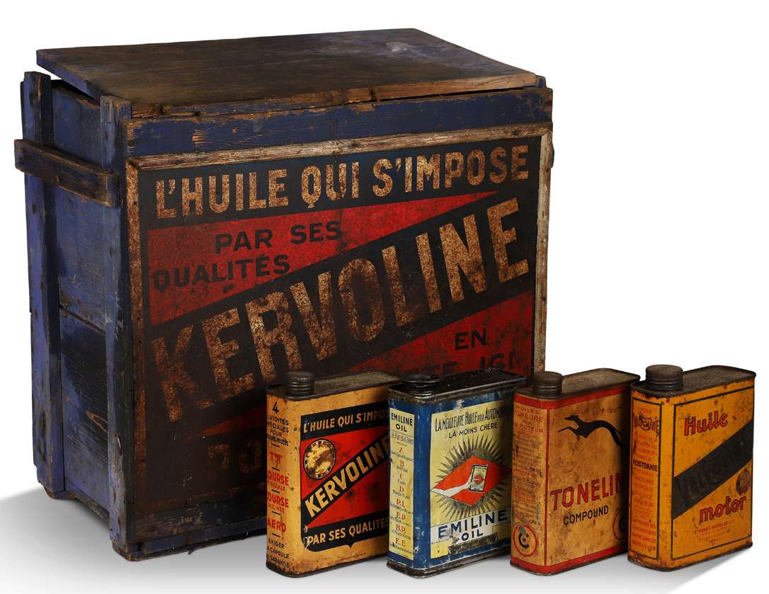 Lot comprenant une caisse en bois peint avec 1 tôle lithographiée et 4 bidons 2 l : Kervoline, Emiline Oil, Toneline, Valvoline 52 X 62 X 32 cm env. ref 448