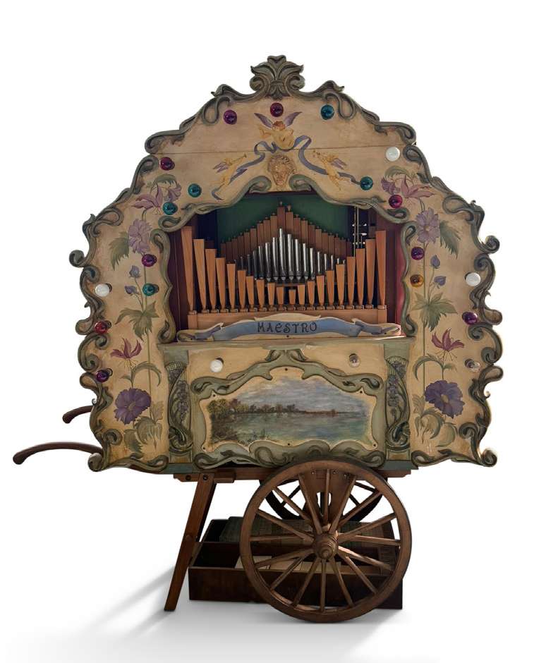 Orgue de barbarie sur roues avec sa série de cartons perforés, décor en bois peint, éclairé