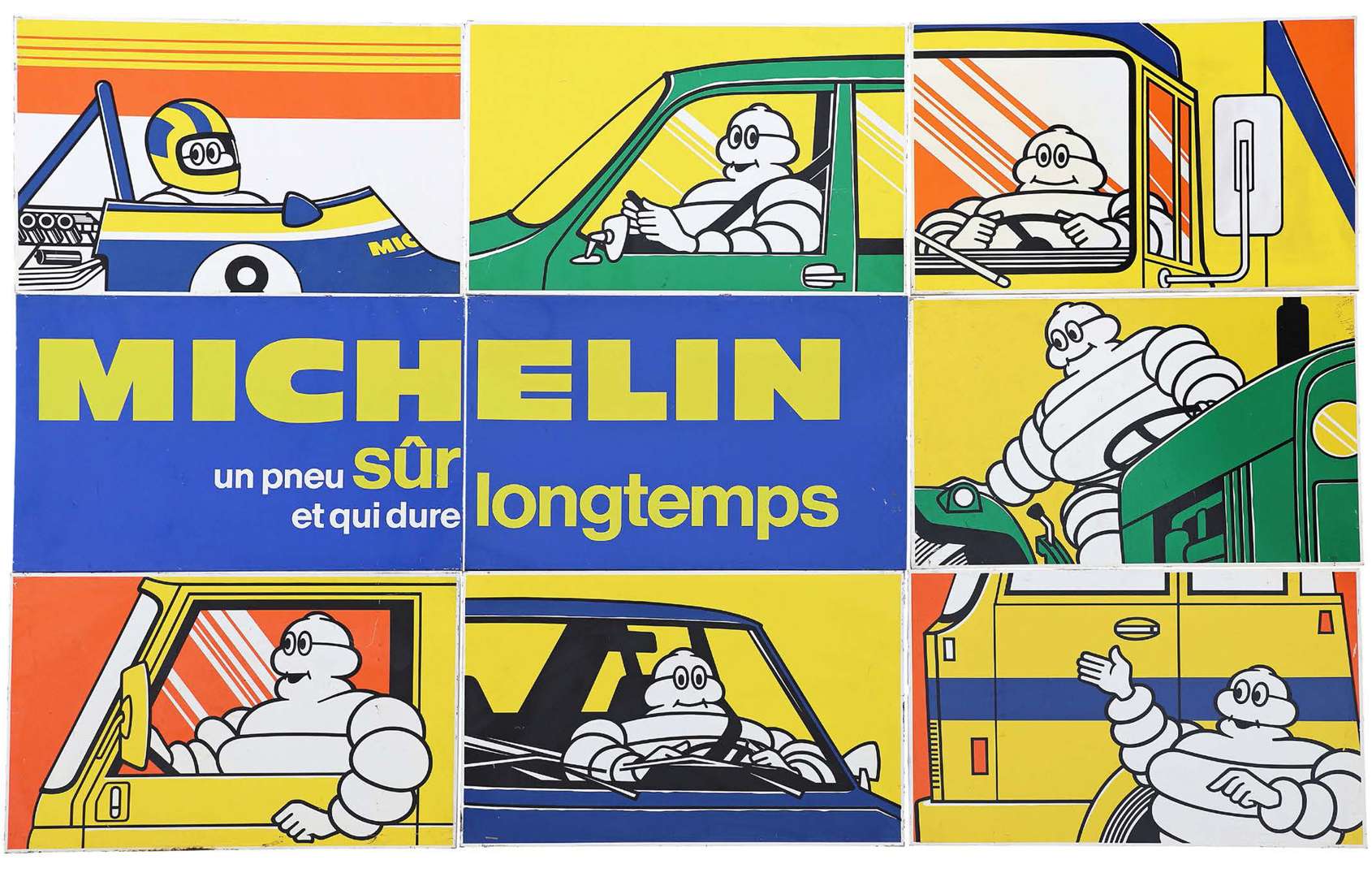 Un pneu sûr et qui dure longtemps Fresque murale composée de 9 tôles lithographiées Chagnon Plaque : 120 X 77 cm env. Ref 423