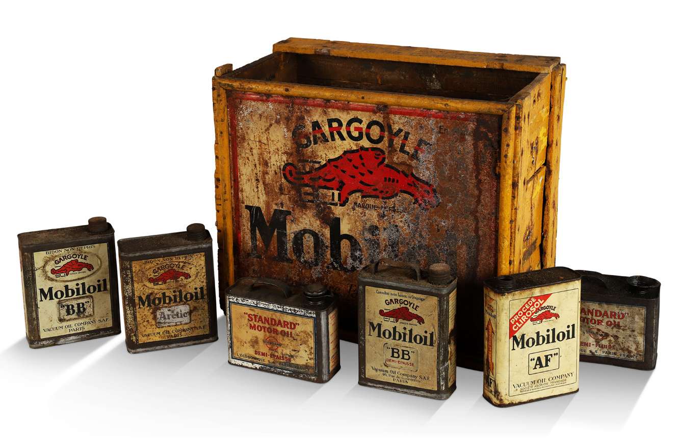 Lot comprenant une caisse en bois peint avec 3 tôles lithographiées, 4 bidons et 2 bidons Standard 50 X 58 X 38 cm env. Ref 452