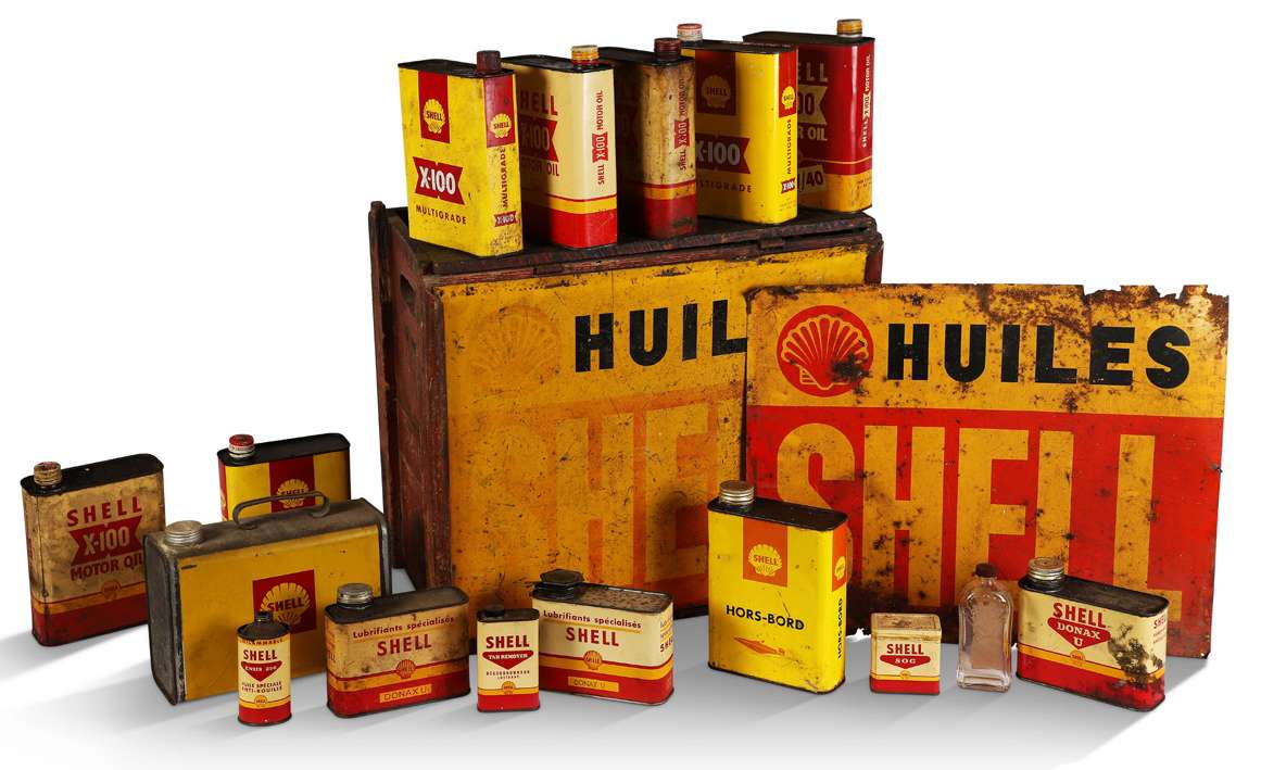 Lot comprenant une caisse en bois peint avec 2 tôles lithographiées, 1 tôle supplementaire (46 X 57 cm), 14 bidons, 1 boîte et 1 flacon en verre 53 X 58 X 33 cm env.