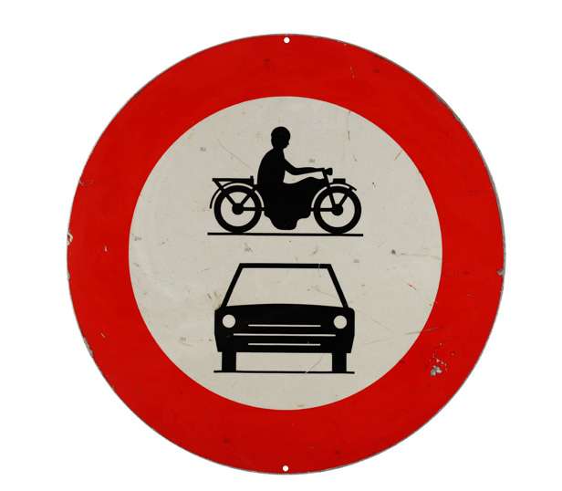 Lot de 4 panneaux en tôle peints Danger vache - 1970 - 56 X 62 cm env. Interdit de doubler (relief) - Lyon 1969 - Diamètre : 50 cm env. Interdit velo, moto (relief) - Signaux Laporte Lyon 1973 - Diamètre : 70 cm env. Interdit voiture, moto - Diamètre : 40 cm env.