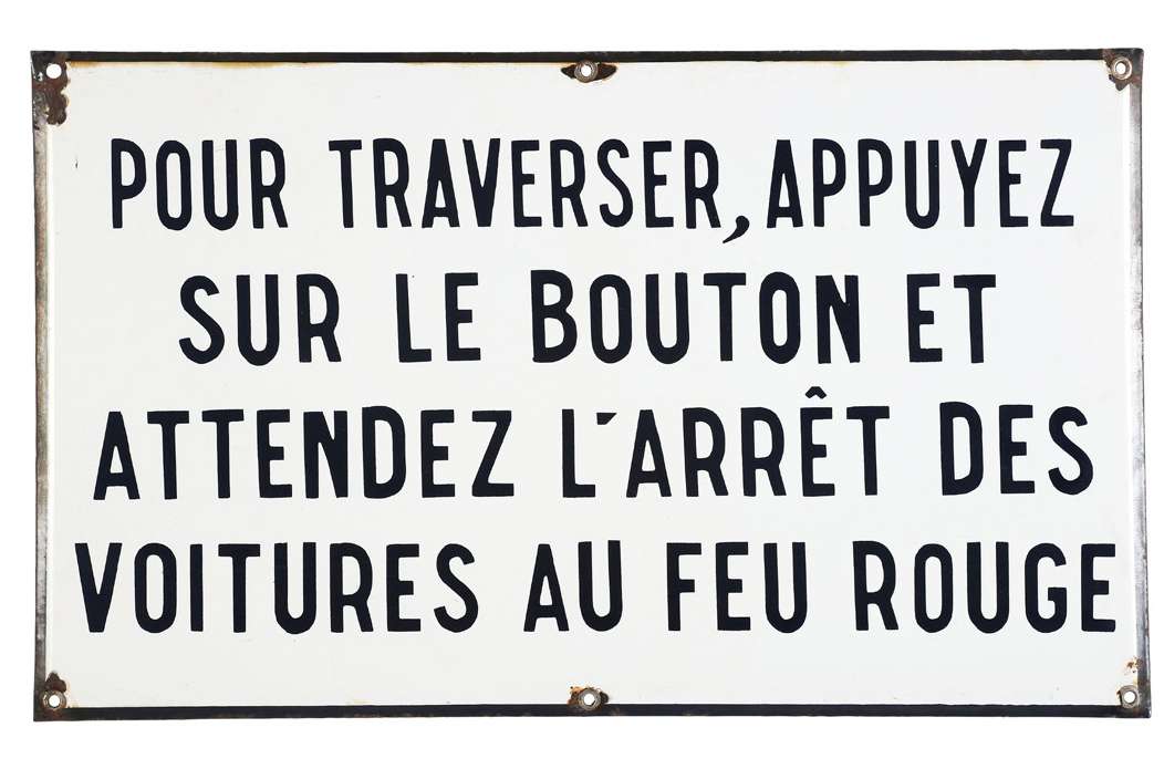 Pour traverser, appuyez sur le bouton et attendez l'arrêt des voitures eu feu rouge Plaque en tôle émaillée 30 X 50 cm env.