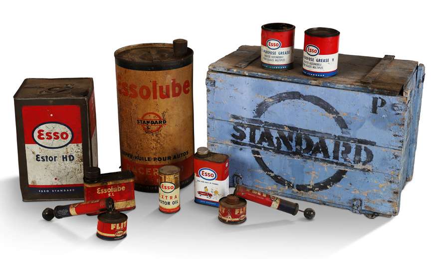 Lot comprenant une caisse en bois peint, 4 bidons, 3 boîtes de graisse et 2 pulveisateurs