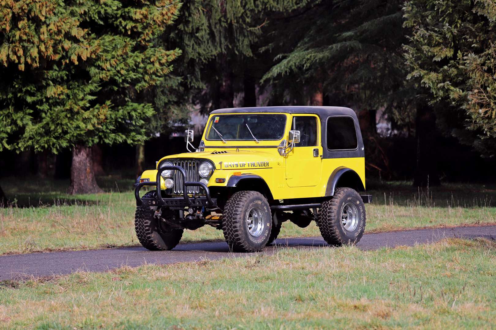 - L’exemplaire que nous présentons est née en sage version Renegade, avec un moteur 4-cylindres 2,5 l essence. Rebaptisée « Days of thunder » (Jours de tonnerre), elle a depuis reçu un moteur Chevrolet V8 5 l… comme les Golden Eagle et Hawk.