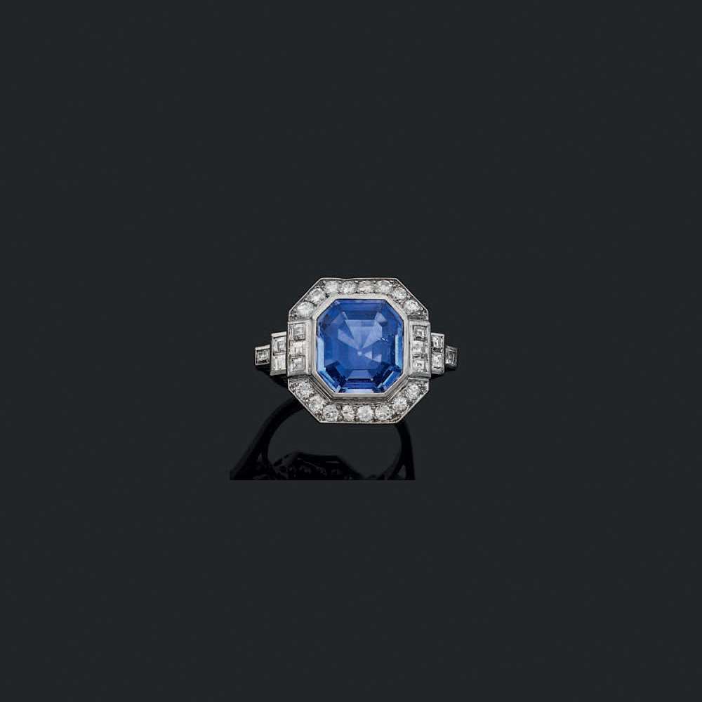 Saphir rectangle à pans coupés, diamants taille brillant et diamants calibrés