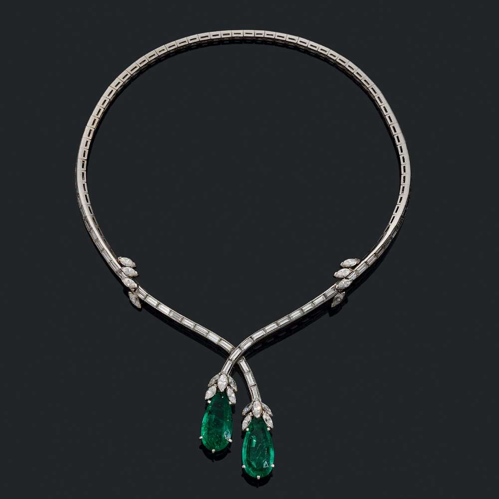 Diamants baguettes et navettes, émeraudes poires en pampille