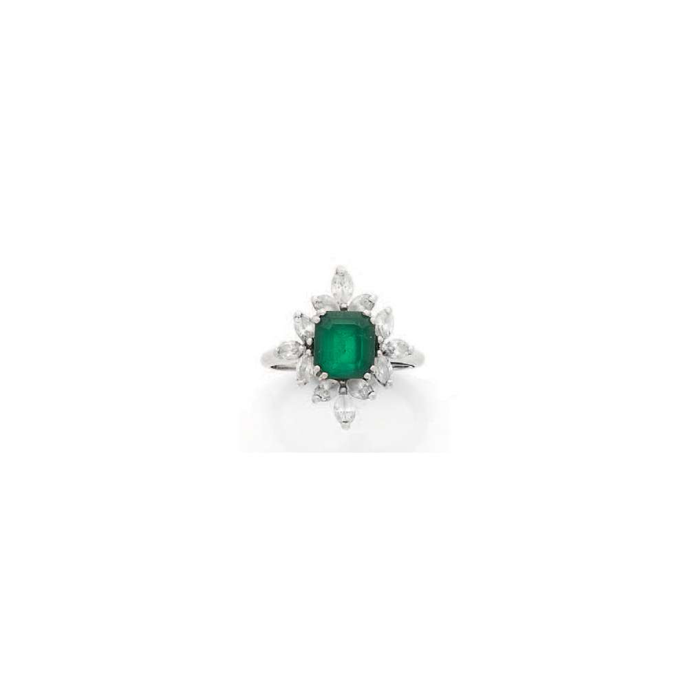Émeraude rectangulaire à pans coupés et diamants navettes