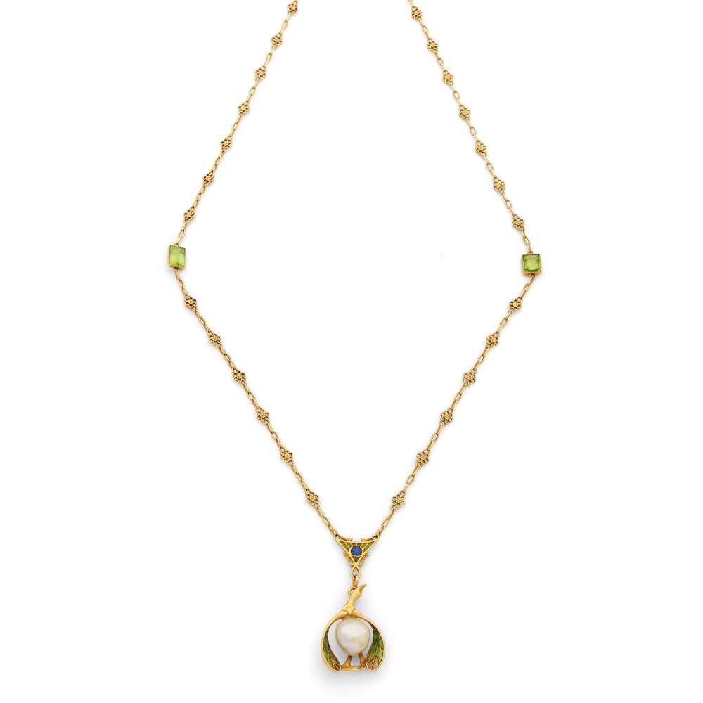 An enamel, pearl, peridot, sapphire and gold necklace