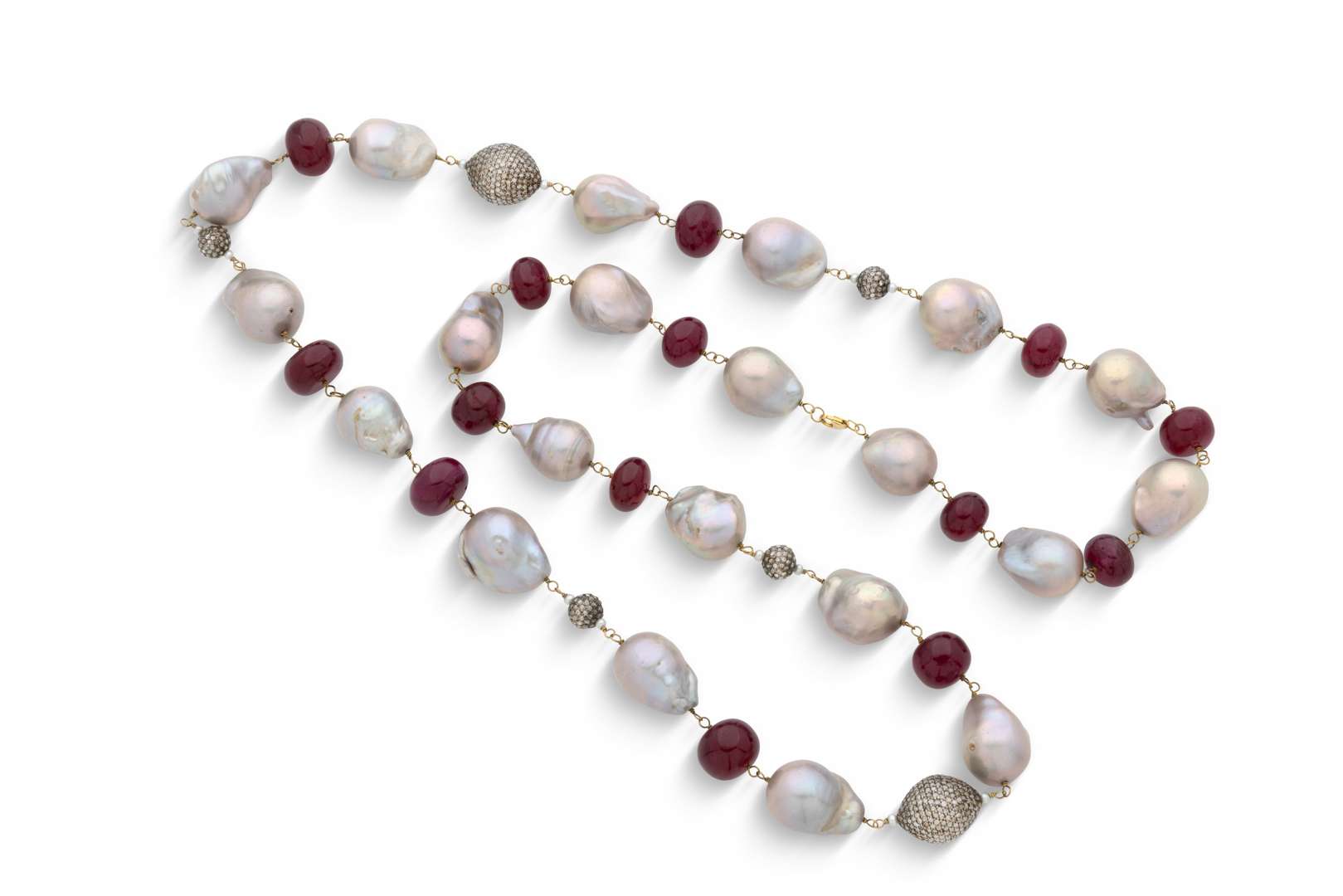 Perles de culture baroques, rubis cabochons et diamants ronds