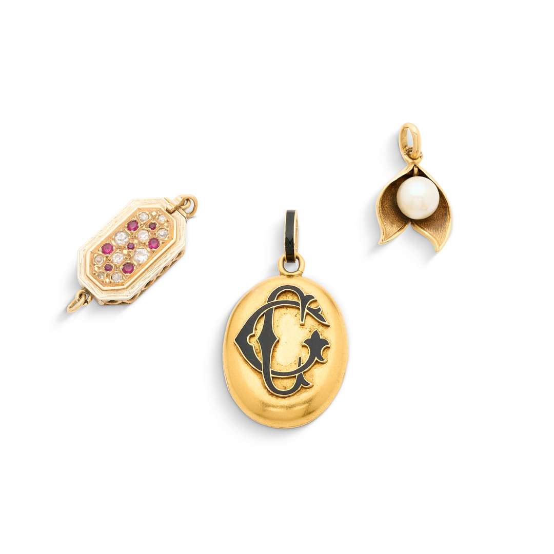 • Pendentif à secret, or 18k (750) et émail. Gravé “CC”. H. : 4 cm env. - Pb. : 10.2 g (verre à l'intérieur)
