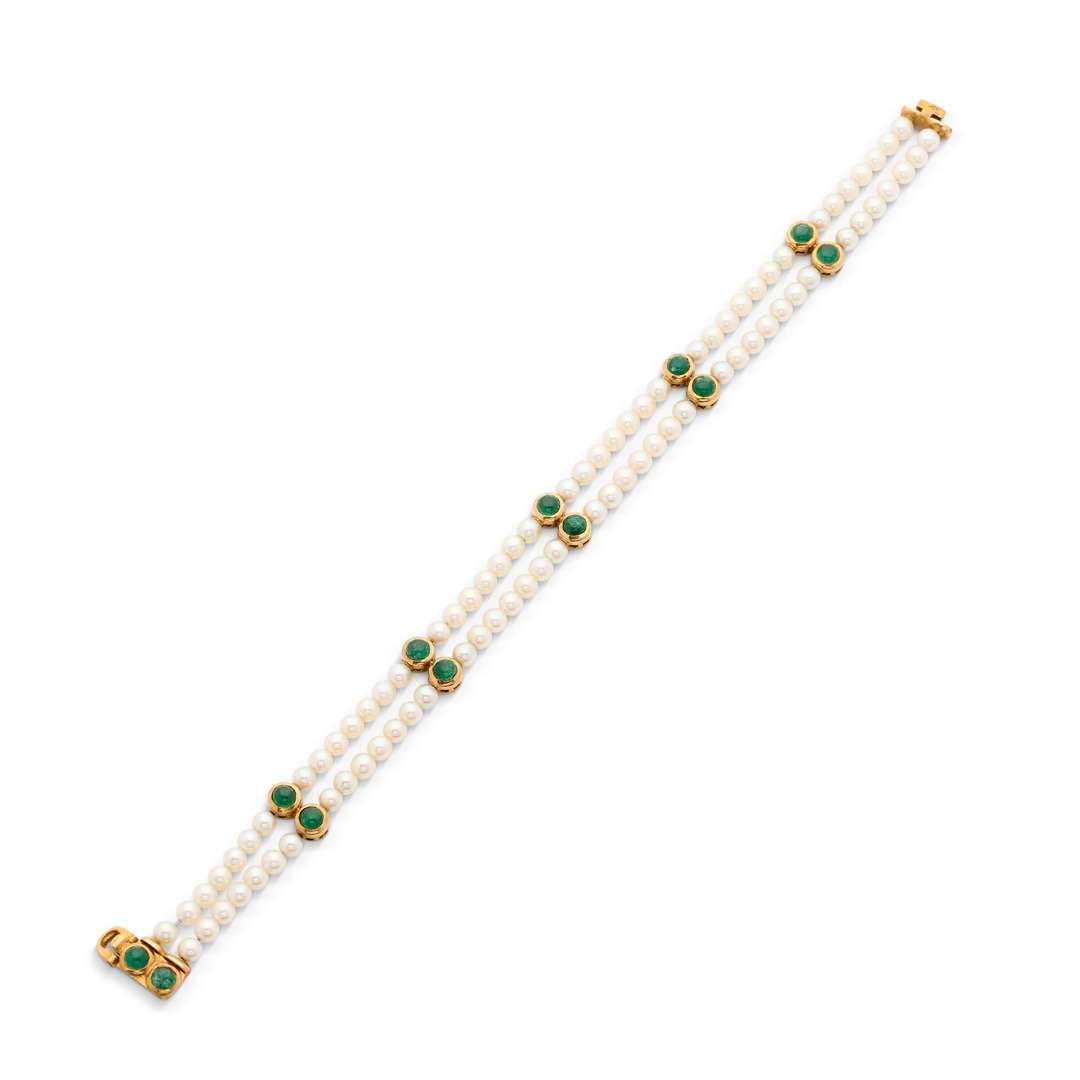 Double rang de perles de culture et émeraudes cabochons