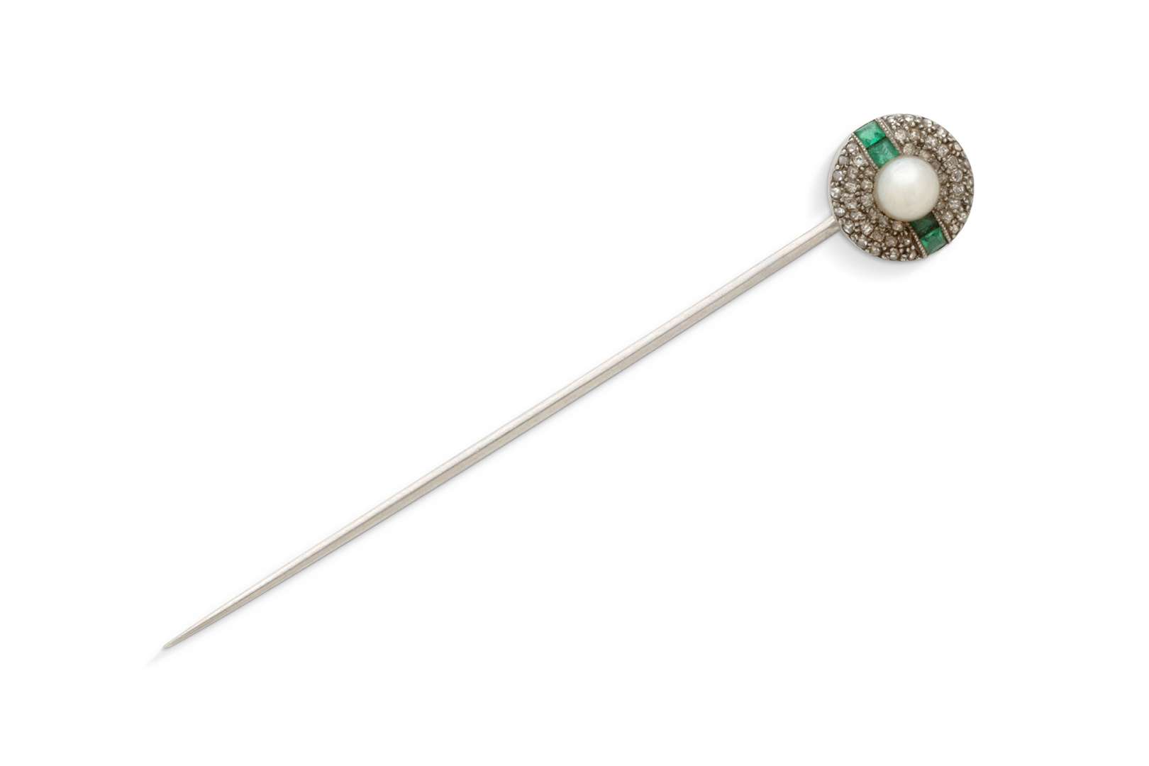 Perle de culture, émeraudes calibrés, diamants taille rose