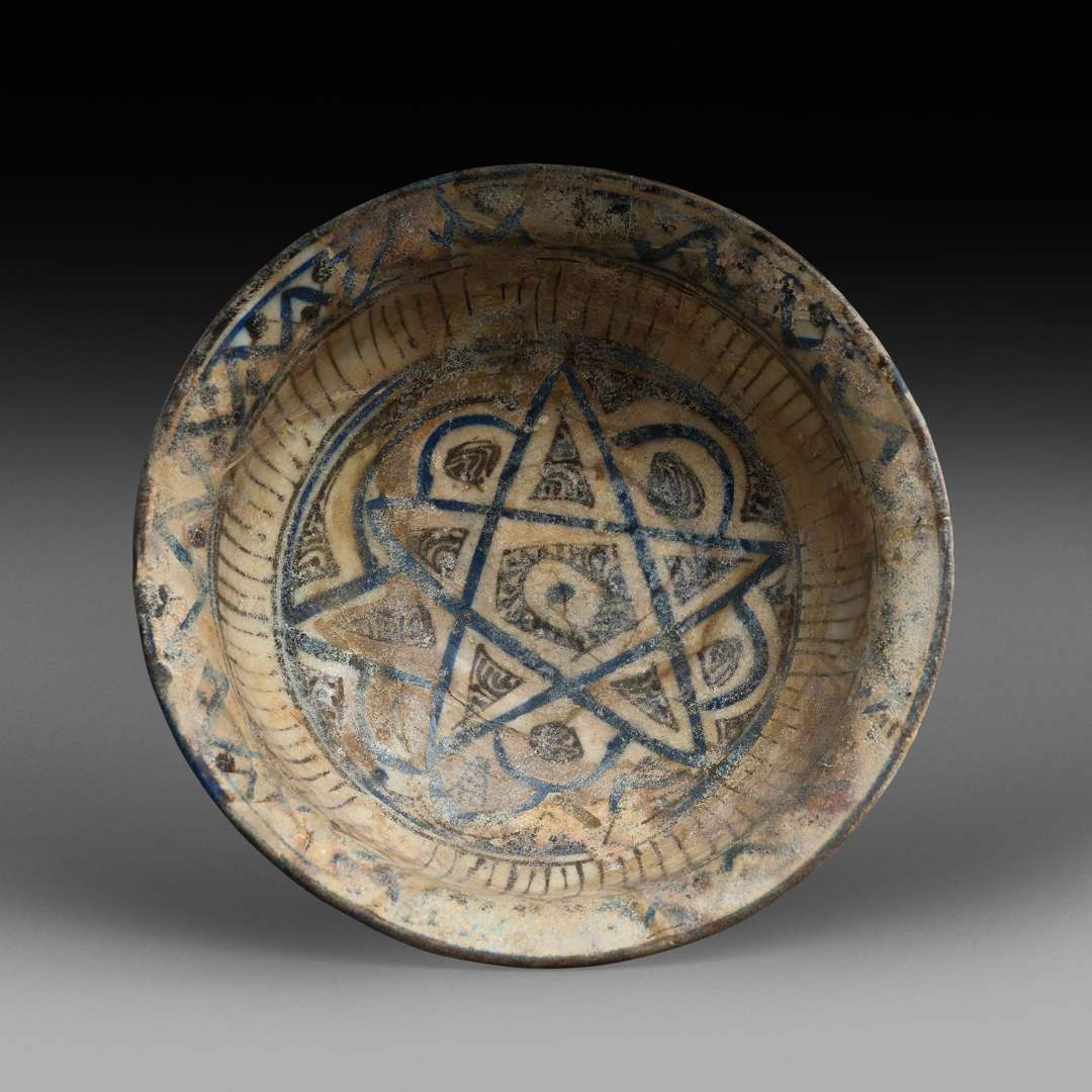 en céramique siliceuse, décor central d'étoile à cinq branche en bleu et noir avec décor de frises.