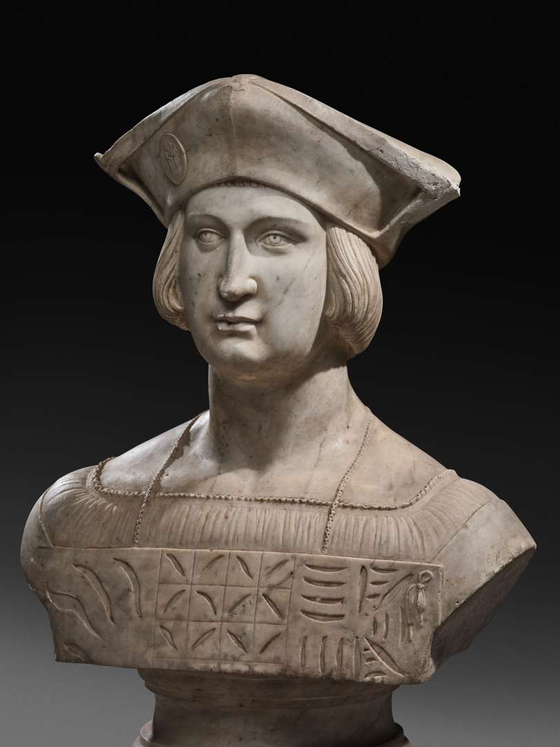 en marbre blanc sculpté portrait d'un homme vêtu à la mode de la Renaissance et coiffé d'une barrette sur laquelle est accrochée une médaille de la Sainte Famille, sur un piédouche. Peut être Christophe Colomb.