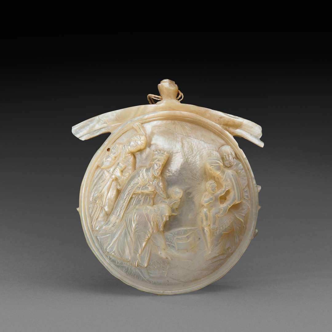entièrement sculptée représentant en bas relief une Adoration des Mages.