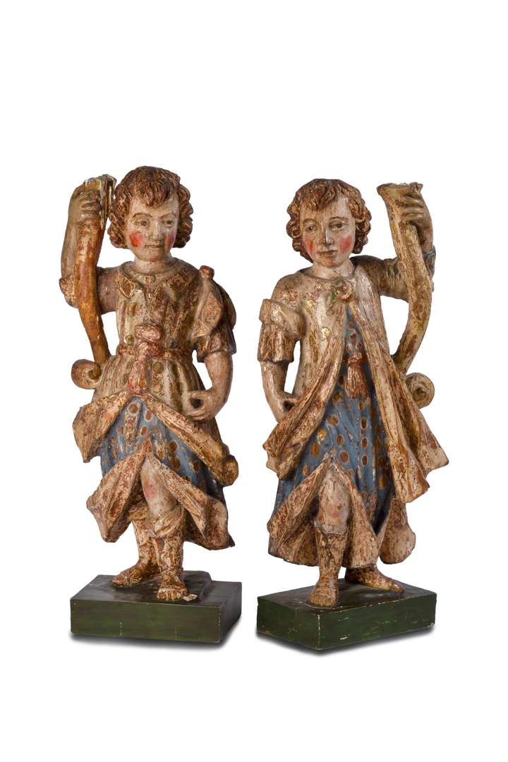 se tenant chacun debout en bois sculpté, peint polychrome et en partie doré.