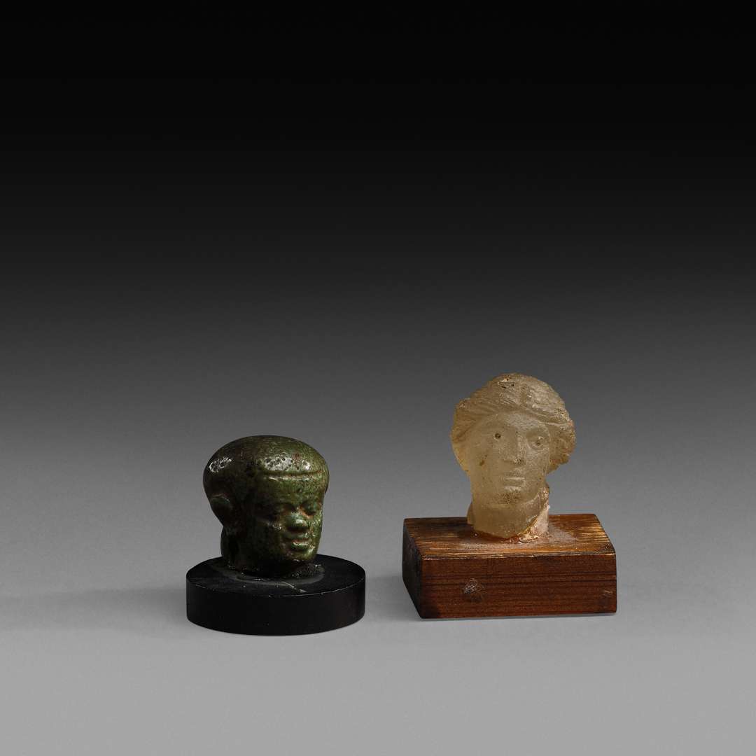 - Une tête de Ptah Patèque en céramique siliceuse verte avec bélière arrière. Égypte Antique, époque Ptolémaïque. Hauteur : 2,2 cm
