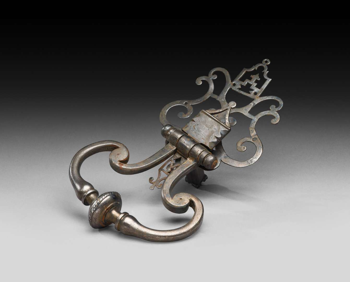 en fer forgé avec sa platine repercée, fort anneau à nœud de frappe ciselé. Ecrou de fixation originel