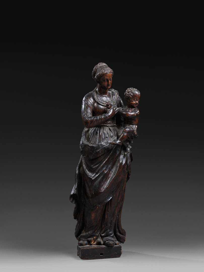 en bois de noyer sculpté et patiné. L'Enfant Jésus, nu, est représenté souriant et porté sur le bras gauche de la Vierge qui tient de sa main droite le bras droit bénissant de l'Enfant. La Vierge est coiffé à la manière du temps de la sculpture.