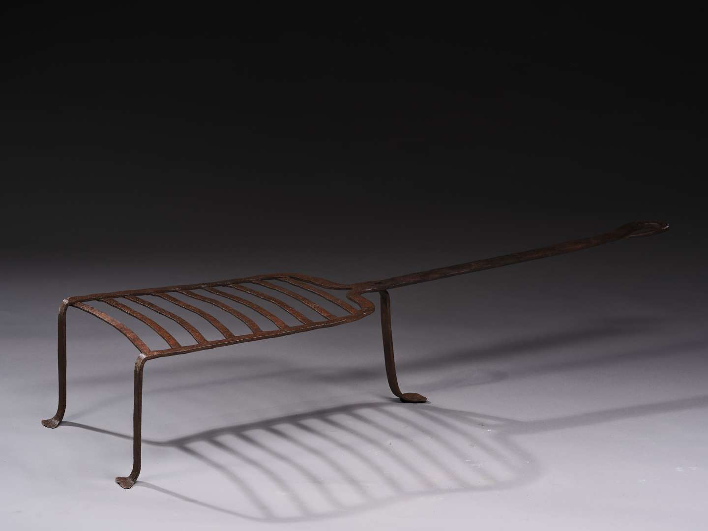 en fer forgé, sur un piètement tripode. Grille à neuf barres parallèles soudées à une fourche au bout d'un long manche à accrocher.