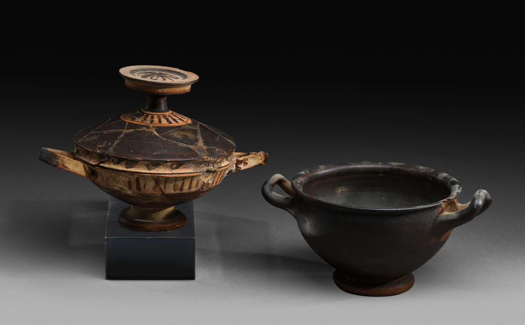 On y joint un cratère en terre vernissé noire.
