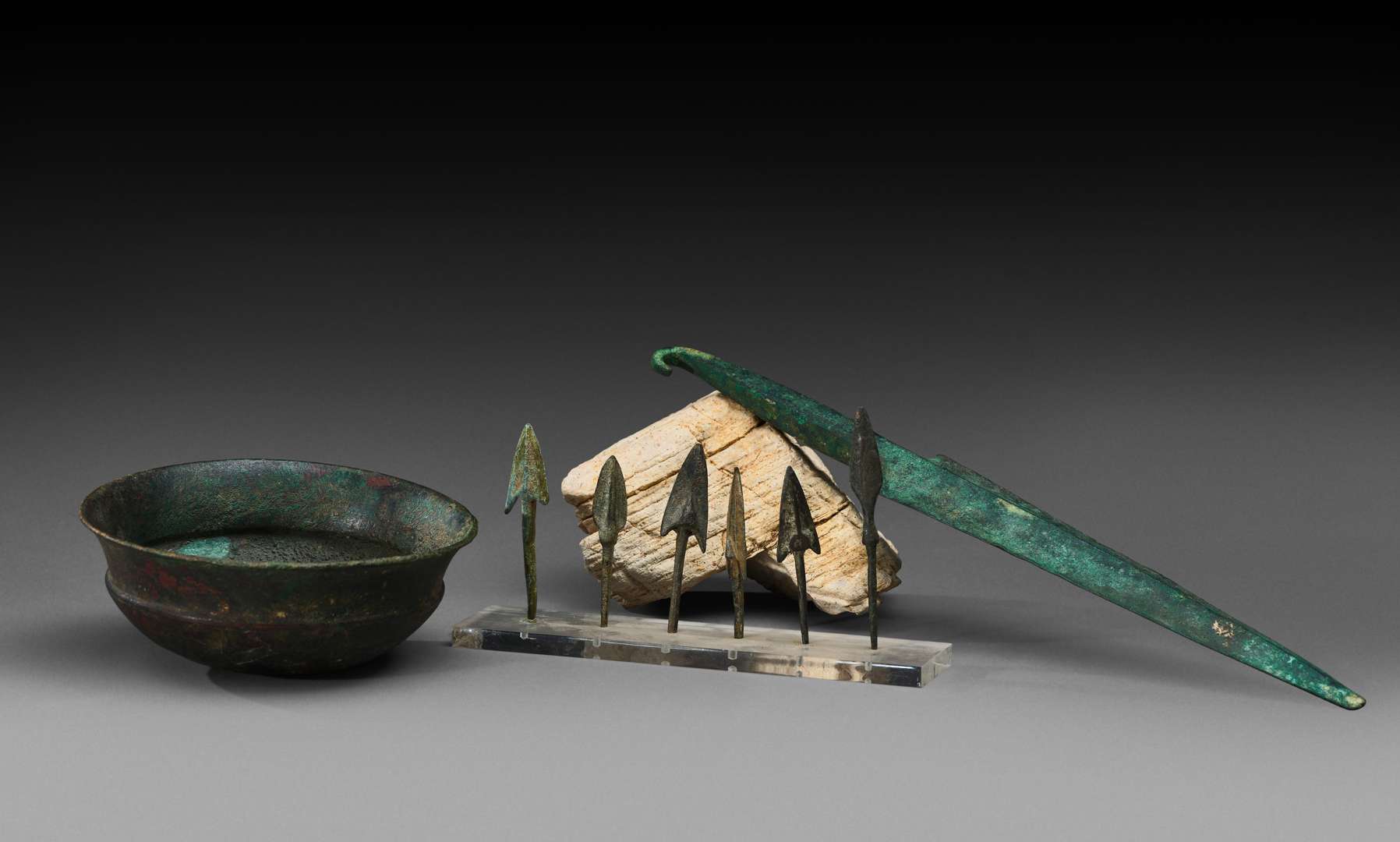 - un grand fer de lance ou poignard à lame triangulaire. Chypriote ancien III, vers 2000 avant Jésus-Christ. Longueur : 34 cm