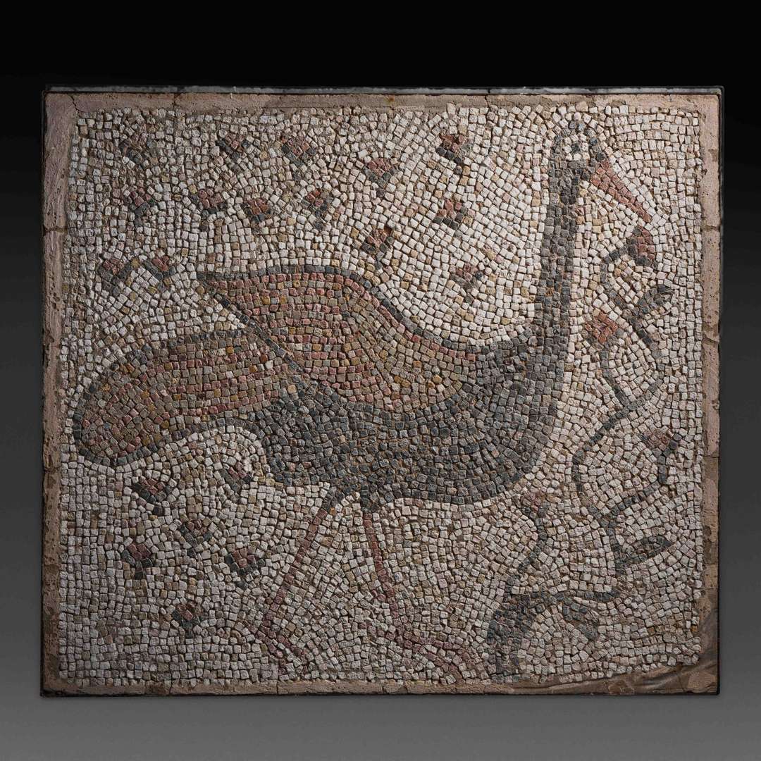 représentant un oiseau échassier à long bec parmi des végétaux stylisé. Tesselles colorées sur fond de tesselles beiges.