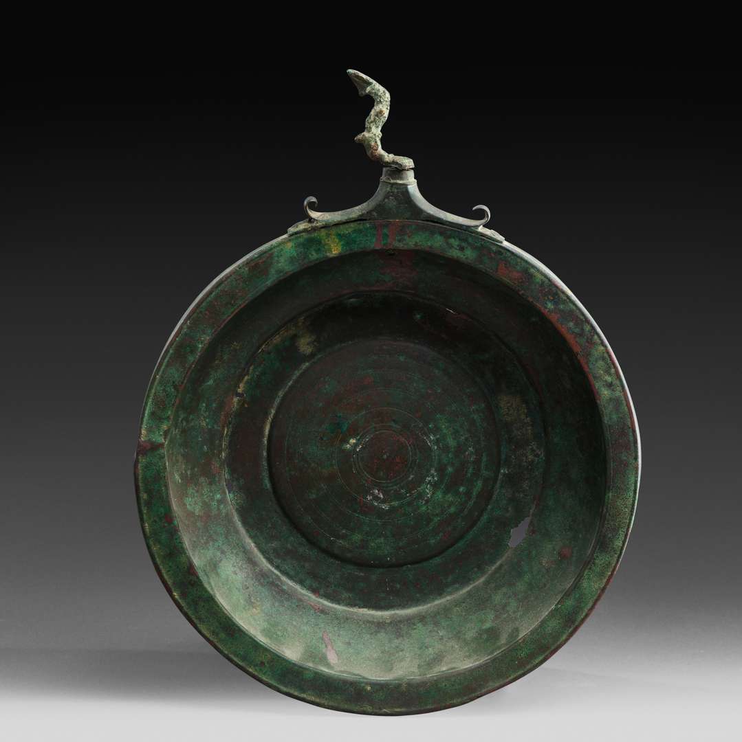 en bronze, la cuve à décor gravé de cercles concentriques. Poignée (rapportée ?) en forme sinueuse terminée en pointe de flèche.