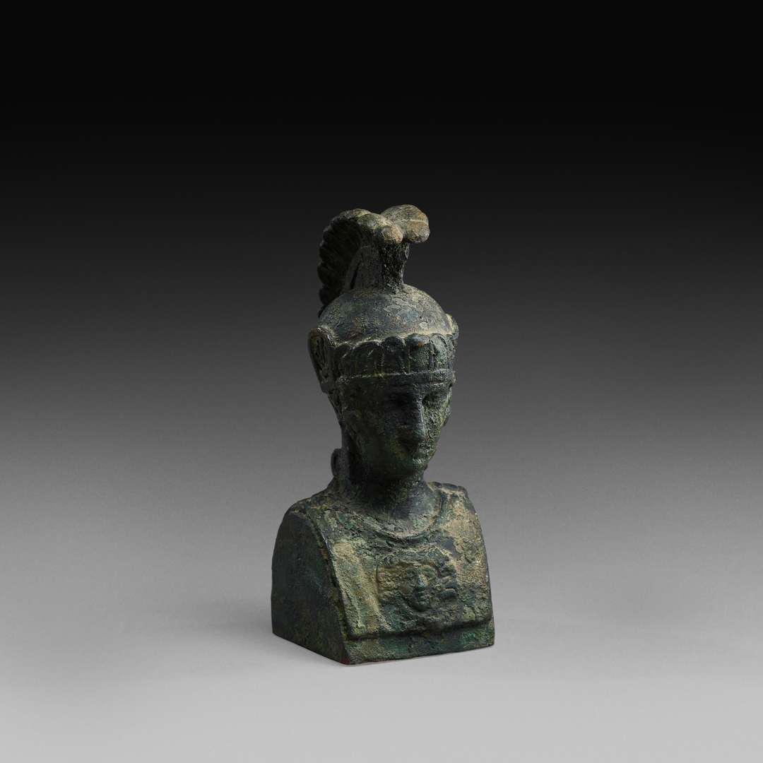 représenté avec la typologie en hermès, coiffé d'un important casque à crète. Fonte creuse.
