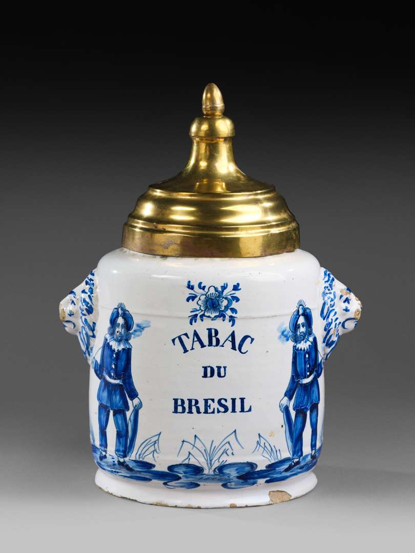 Le pot en faïence blanche à prises latérales en forme de mufles de lion, décor bleu de deux personnages fumant la pipe et inscription “TABAC DU BRESIL”. Couvercle de laiton en chapeau chinois.