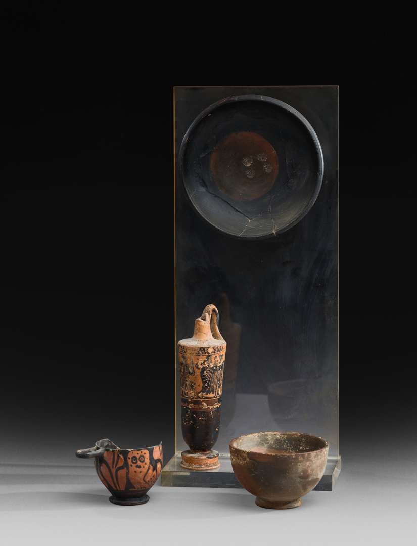 A laquelle on joint un bol, une coupe (accidentée) et un lécythe (accidenté).