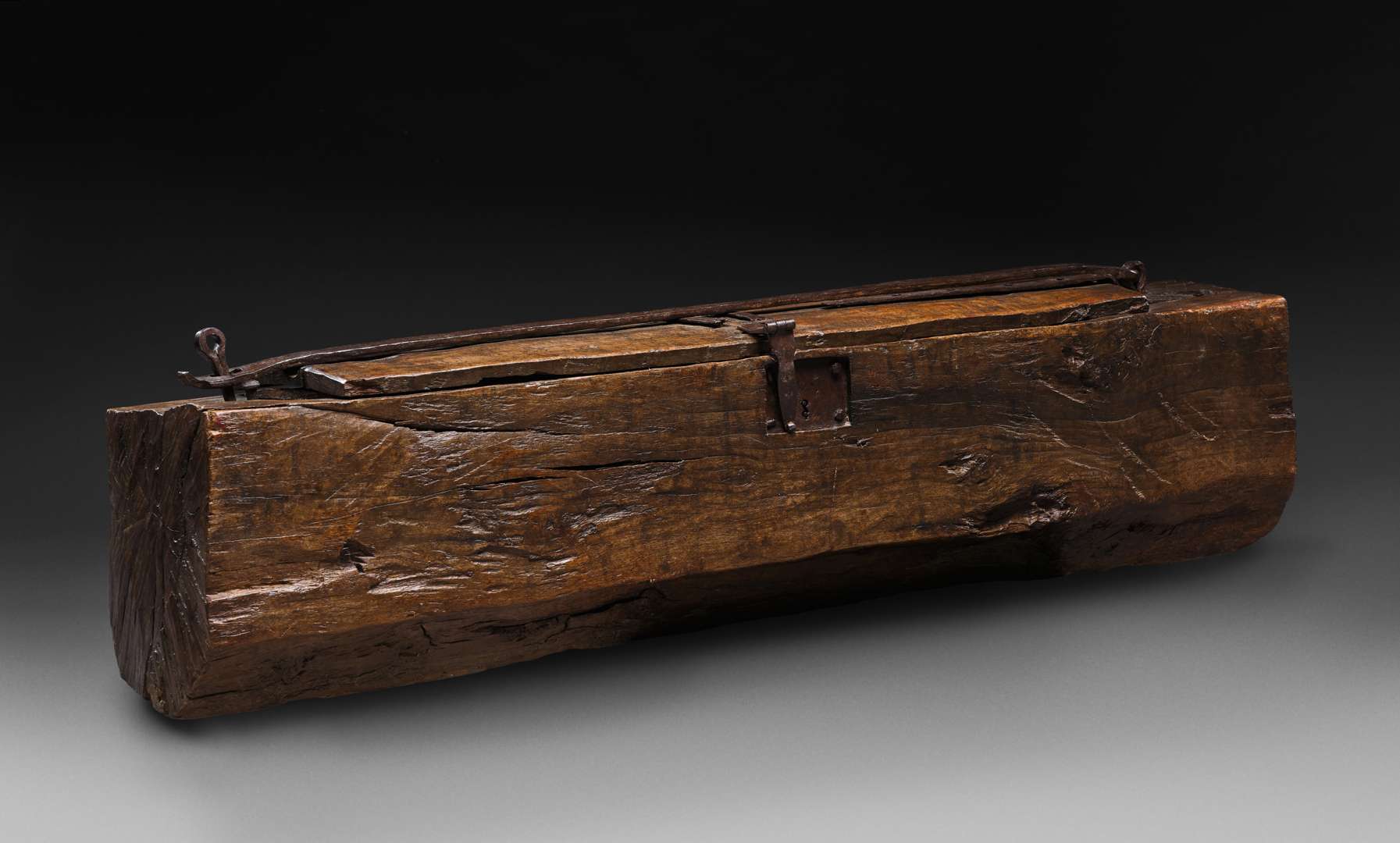 Rare et massif coffre fort creusé de type “dug-out chest” fait dans un tronc monoxyle de chêne à renforts de fer forgé. La fixation du couvercle supérieur articulé d’un côté par une longue ferrure à agrafe et une cheville pour un cadenas ; deux autres bandes en pentures de fer en renfort sur le couvercle se termine par des moraillons à serrure supplémentaires à l’avant et à l’arrière. La cavité intérieure d'une singulière forme à été façonnée pour un accueillage particulier des vases sacrés ou d'une précieuse statuette reliquaire.