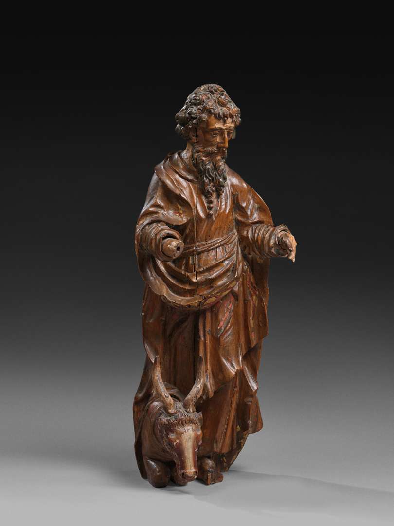 en bois de noyer sculpté avec traces de polychromie ancienne. Le saint se tient debout, le bœuf emblématique allongé à ses pieds.
