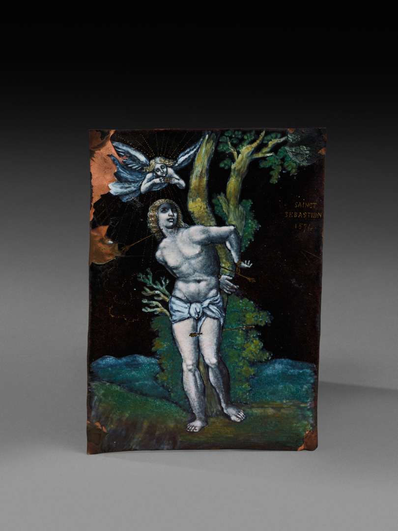 Plaque rectangulaire d'émail peint polychrome sur plaque de cuivre rectangulaire légèrement emboutie. Le martyr de Saint Sébastien attaché à un arbre tandis qu'un ange, du ciel, lui remet la couronne du Martyr. Inscriptions à l'or peint : "SAINCT / SEBASTIEN / 1574". Rehauts d'or peint. Contre émail brun.