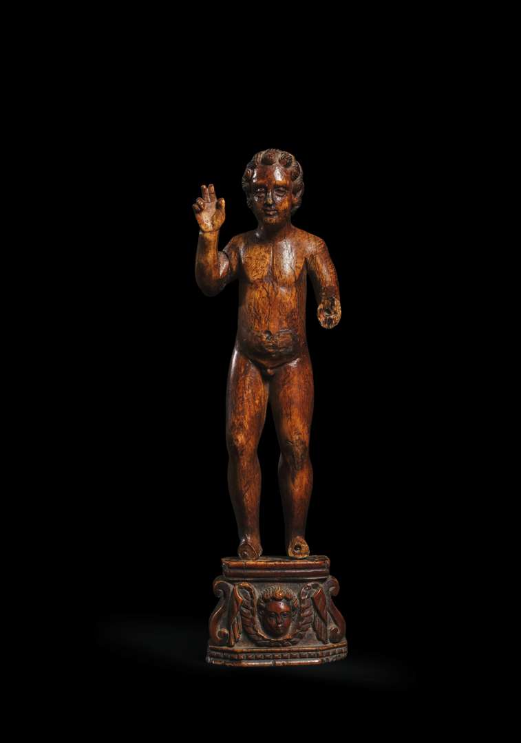 Statuette en ivoire sculpté en ronde-bosse et patiné, figurant l'Enfant Jésus se tenant debout, nu, le bras droit bénissant. Traces de dorure dans les bouclettes de la chevelure. Il repose sur un socle sculpté d'ivoire en léger relief à décor renaissant d'une tête d'ange ailée.