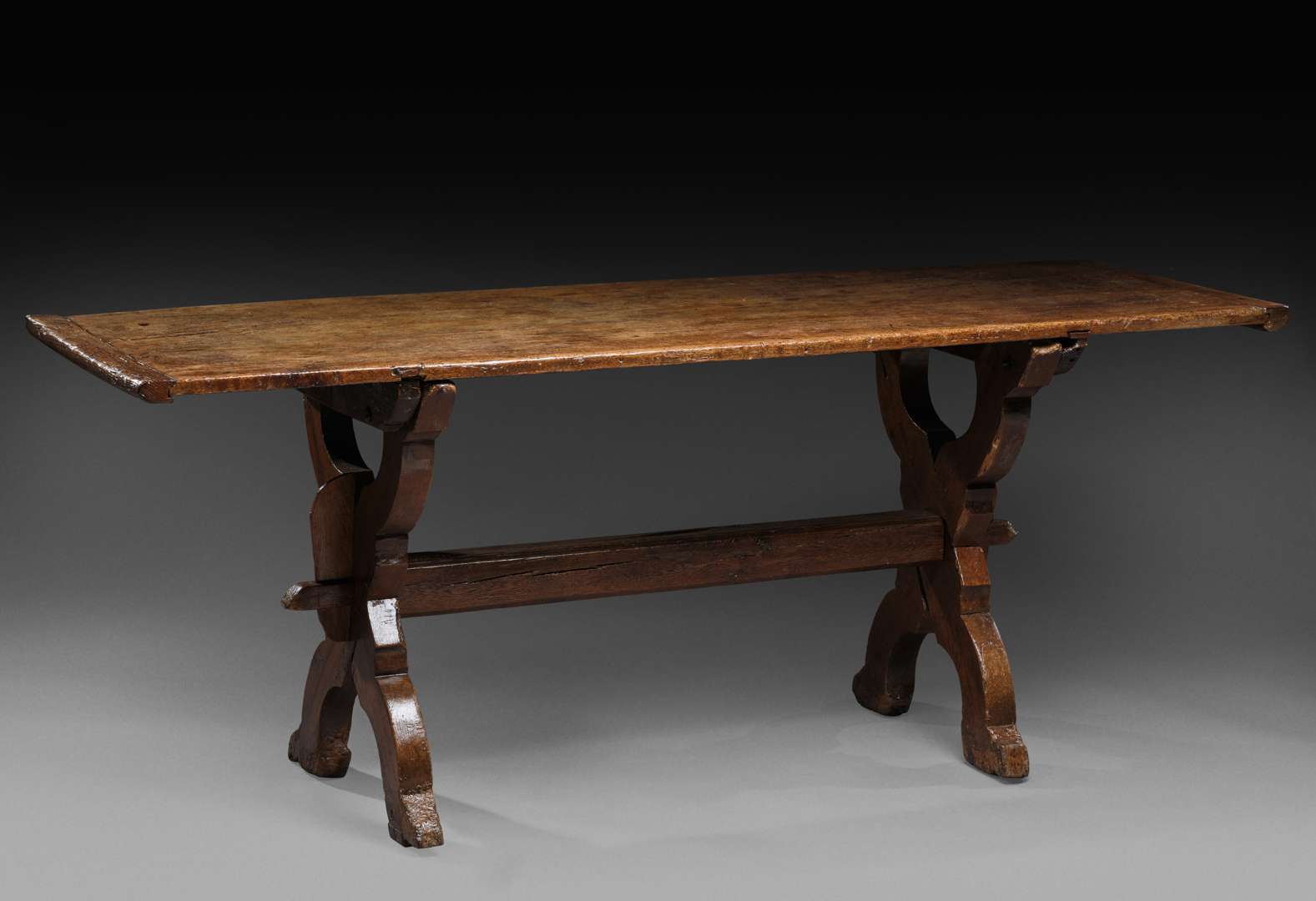 en bois. Long plateau en deux planches et renforts aux extrémités. Pieds en X avec entretoise à clavettes.