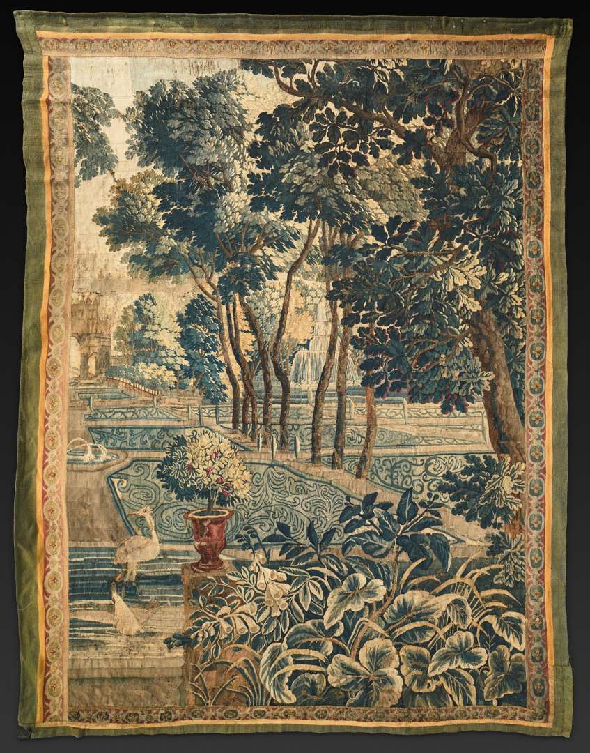 en laine polychrome représentant une scène de jardin. Au premier plan un échassier dans bassin jouxtant une terrasse agrémentée de plantes. L'arrière plan à décor d'un jardin à la française. La bordure à décor de frise de boutons fleuris dans dés réserves.