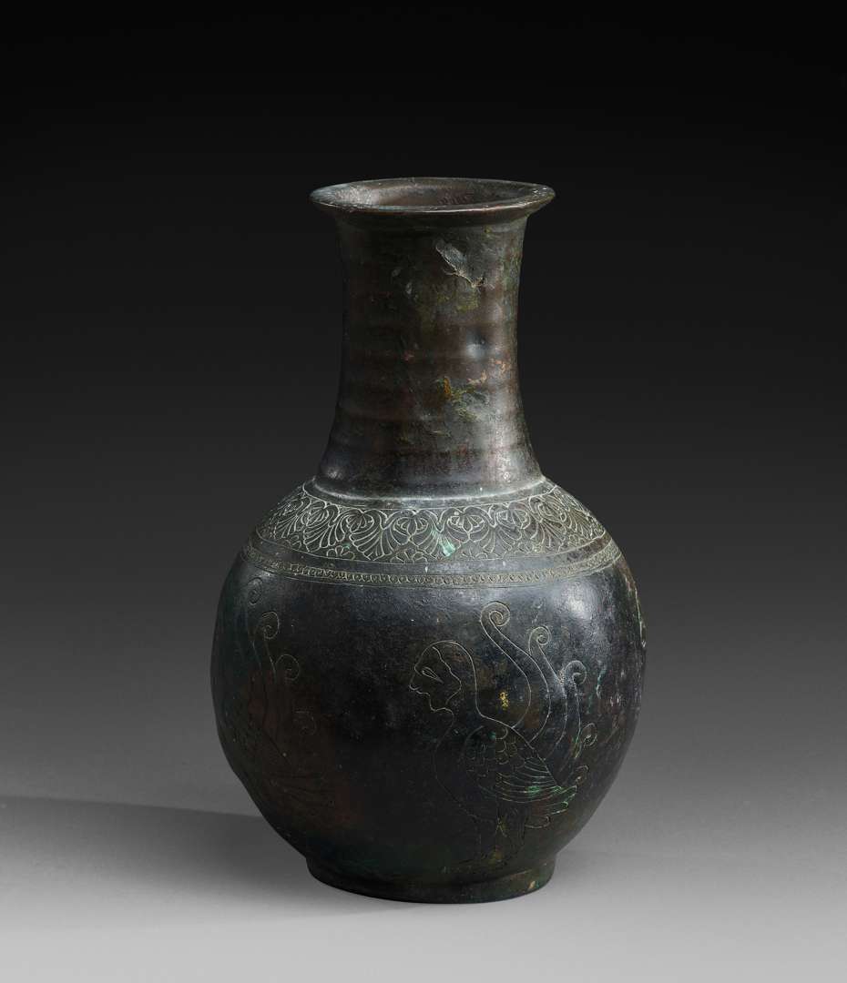 en bronze. Pansu à haut col et décor gravé d'une frise de palmettes à l'épaulement au dessus de quatre harpies.