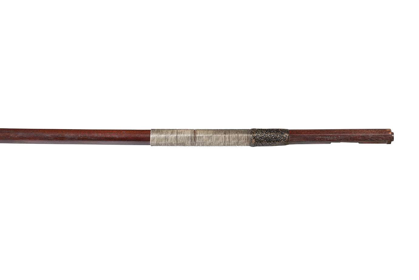 Belle baguette en bois de pernambouc avec marque au fer apocryphe de Vuillaume, hausse et bouton manquant
