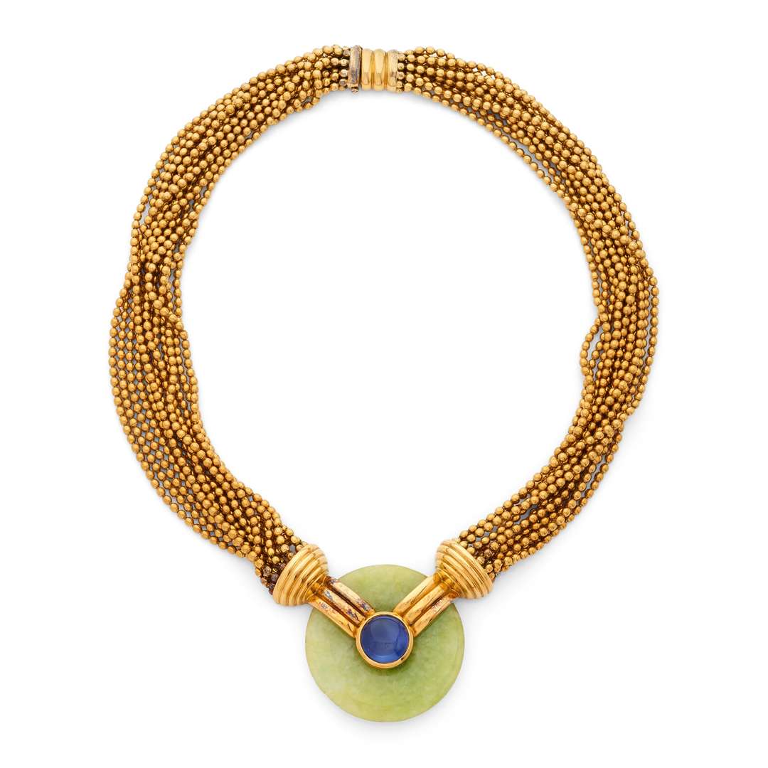 Collier “Torsade”Disque de jade, saphir cabochon Or 18k (750) Signé et numéroté - Ecrin L. : 36 cm env. - Pb. : 112 g