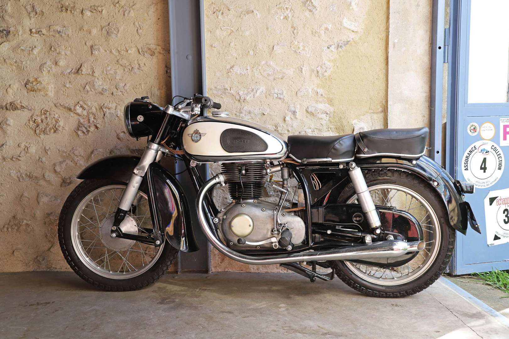 Sous sa robe sobre noire, grise ou vert olive se cache une mécanique d'une cohérence remarquable. Son monocylindre quatre temps de 350 cm³, refroidi par air, développe 24 chevaux à 6 250 tours par minute, transmis aux roues par une boîte quatre vitesses et une chaîne finale. La fourche télescopique hydraulique à l'avant, les deux amortisseurs à l'arrière : rien de révolutionnaire, mais tout d'une machine pensée pour durer. À 145 kg à sec pour un réservoir de 16 litres, elle se montre équilibrée, accessible, honnête.