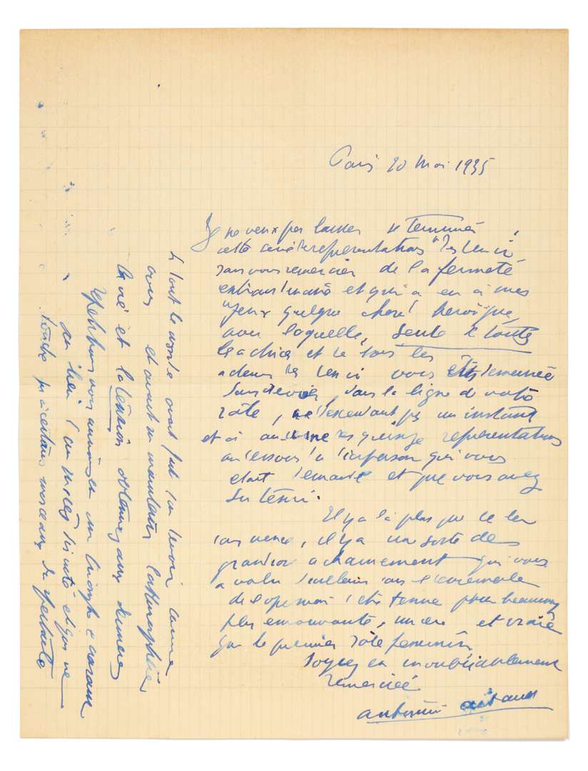 L.A.S. « Antonin Artaud », Paris 20 mai 1935, [à Cécile DENOËL] ; 1 page in-4.