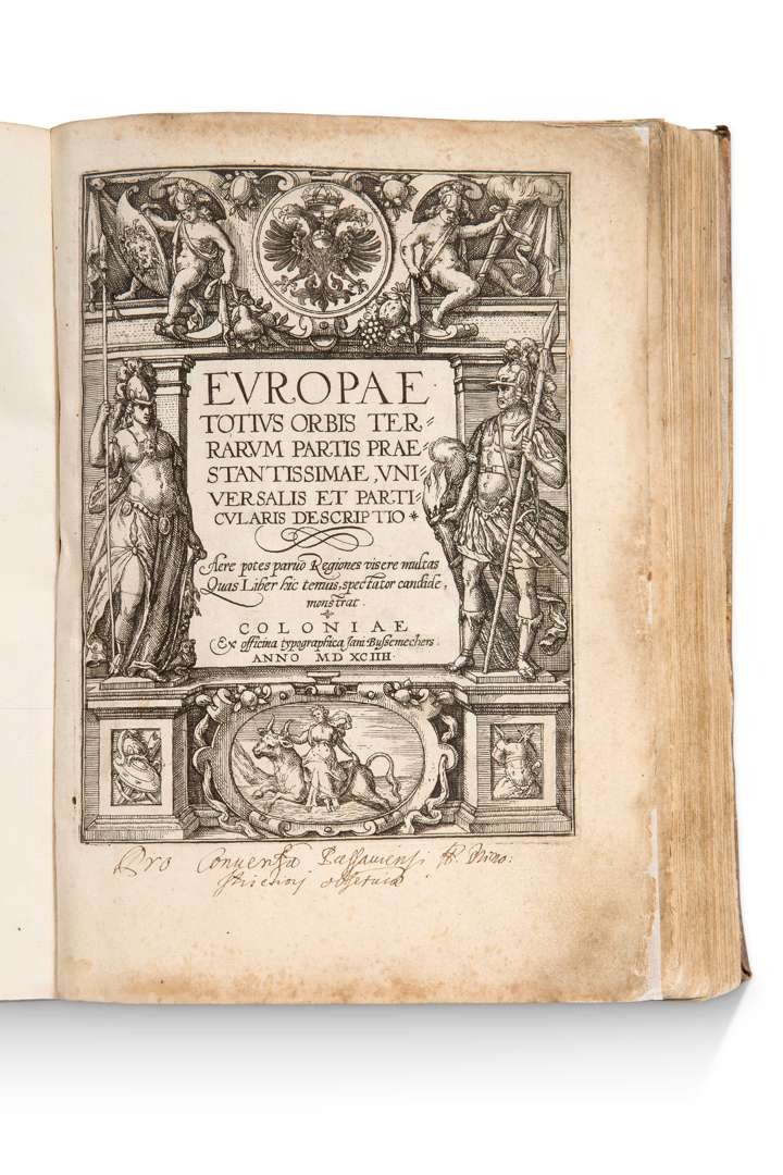 Europae Totius Orbis Terrarum Partis Praestantissime, Universalis et Particularis Descriptio… Coloniae (Cologne), ex officina typographica Jani Bussemchers, anno 1594. In-4 (27,4 x 19,5 cm). [5] ff. (titre, dédicace, préface), 50 cartes, [1] f. (index). Vélin souple de l’époque, dos lisse muet. Cet atlas comporte une page de titre gravée et 50 planches gravées sur cuivre en noir à double page cartographiant l’Europe, dont plusieurs sont ornées de portraits en médaillon de souverains et des armoiries des pays représentés. De nombreuses cartes sont des versions réduites des cartes d'Ortelius. Au colophon : “Coloniae / Typis Lamberti Andreae, sumptibus vero Joannis Buchsemechers. / Anno M. D. XCIII” Note en latin au titre. Philips, I, [2828]. Garde et doublure de contreplat supérieures renouvelées, salissures et taches, lacets/fermoirs manquants, titre restauré, légères rousseurs, légères mouillures marginales.