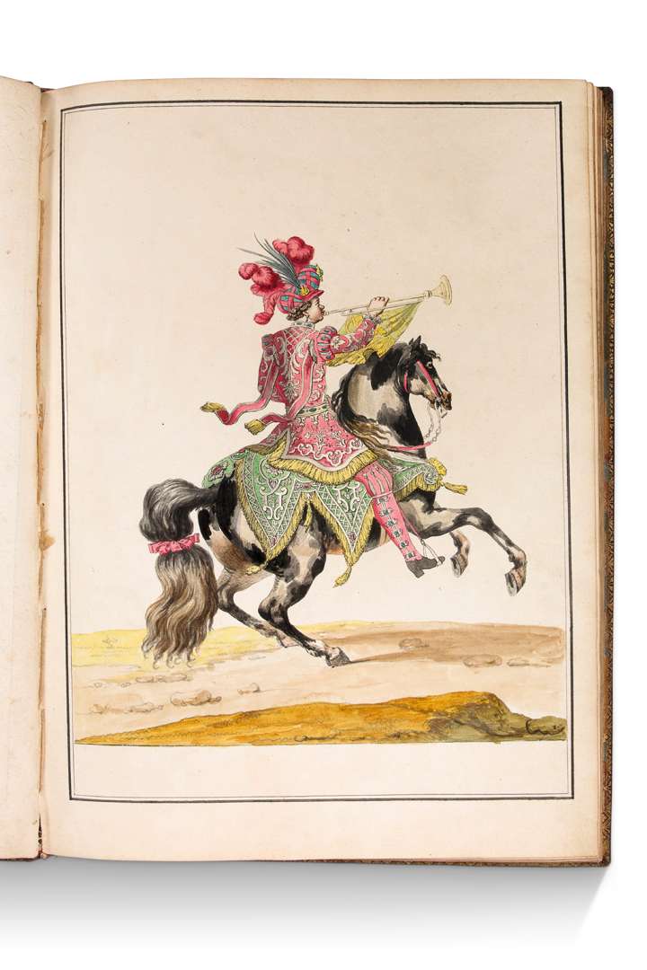 26 estampes au trait, retravaillées à l’aquarelle et à la mine de plomb, dont 24 scènes équestres ou de costumes, d’après les dessins de Jean Bérain (1638-1711).