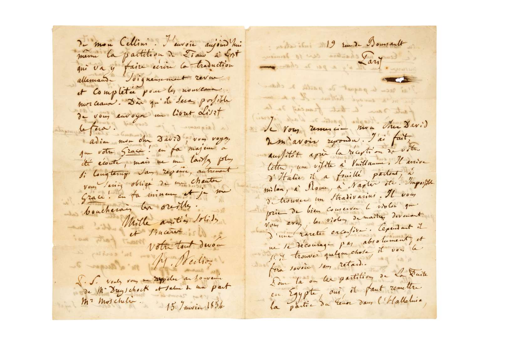 L.A.S. « H. Berlioz », Paris 15 janvier 1854, à Ferdinand DAVID ; 4 pages in-8 (petite fente au pli).