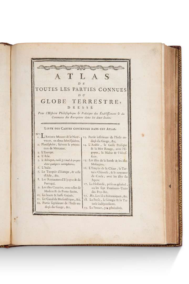Atlas de Toutes les Parties Connues du Globe Terrestre, Dressé pour L'Histoire Philosophique et Politique des Établissemens … [Geneva, J. L. Pellet, ca 1780]. In-4 (26 x 20,5 cm), maroquin rouge de l’époque, dos à 6 compartiments orné du chiffre de Louis XV dans un caisson doré et fleuronné, tranches jaspées, armes dorées poussées au centre des plats. (1)-28pp., 50 cartes à double page numérotées 1 à 49 (avec une 17 bis). Magnifique exemplaire aux armes de Louis XV, complet de ses cartes. Edition originale de cet atlas établi pour illustrer la 3e édition du texte de l’Abbé Raynal et notamment Diderot, Petite usure d’usage à la reliure.