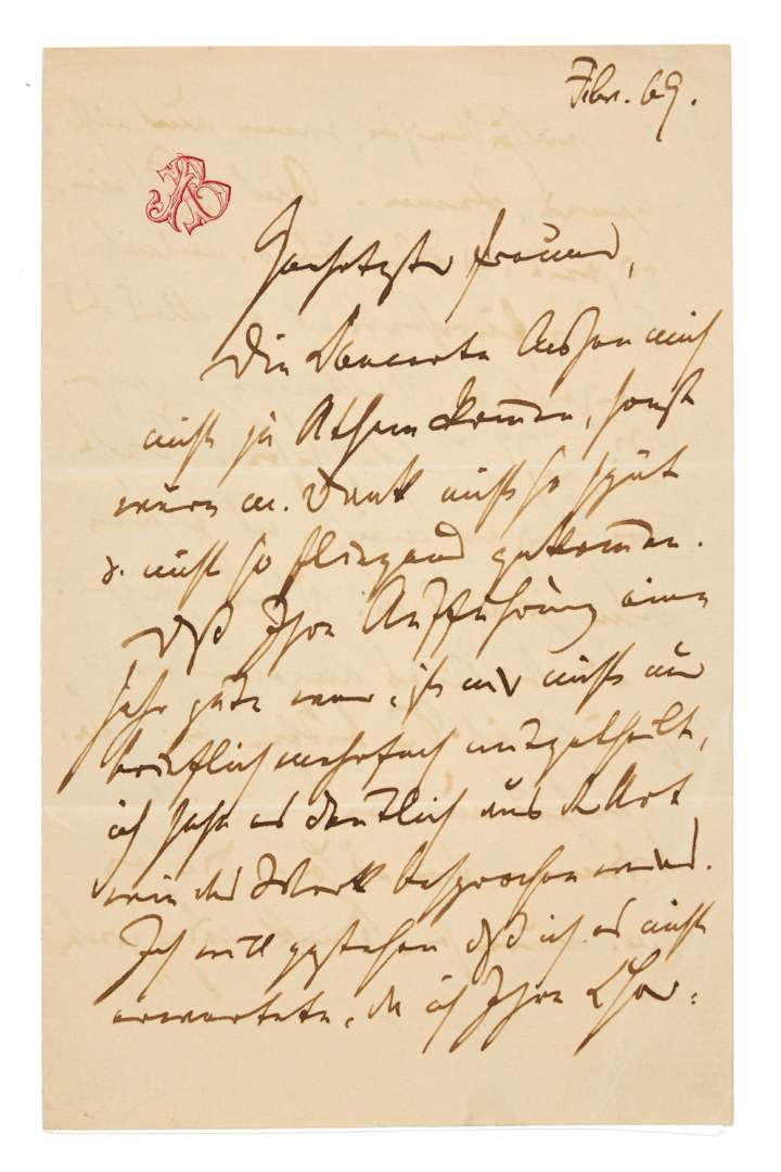 L.A.S. « J. Brahms », [Vienne 25] février 1869, à un ami [Carl REINECKE] ; 3 pages in-8 à son chiffre gravé ; en allemand. Remerciements après la création du Deutsches Requiem.